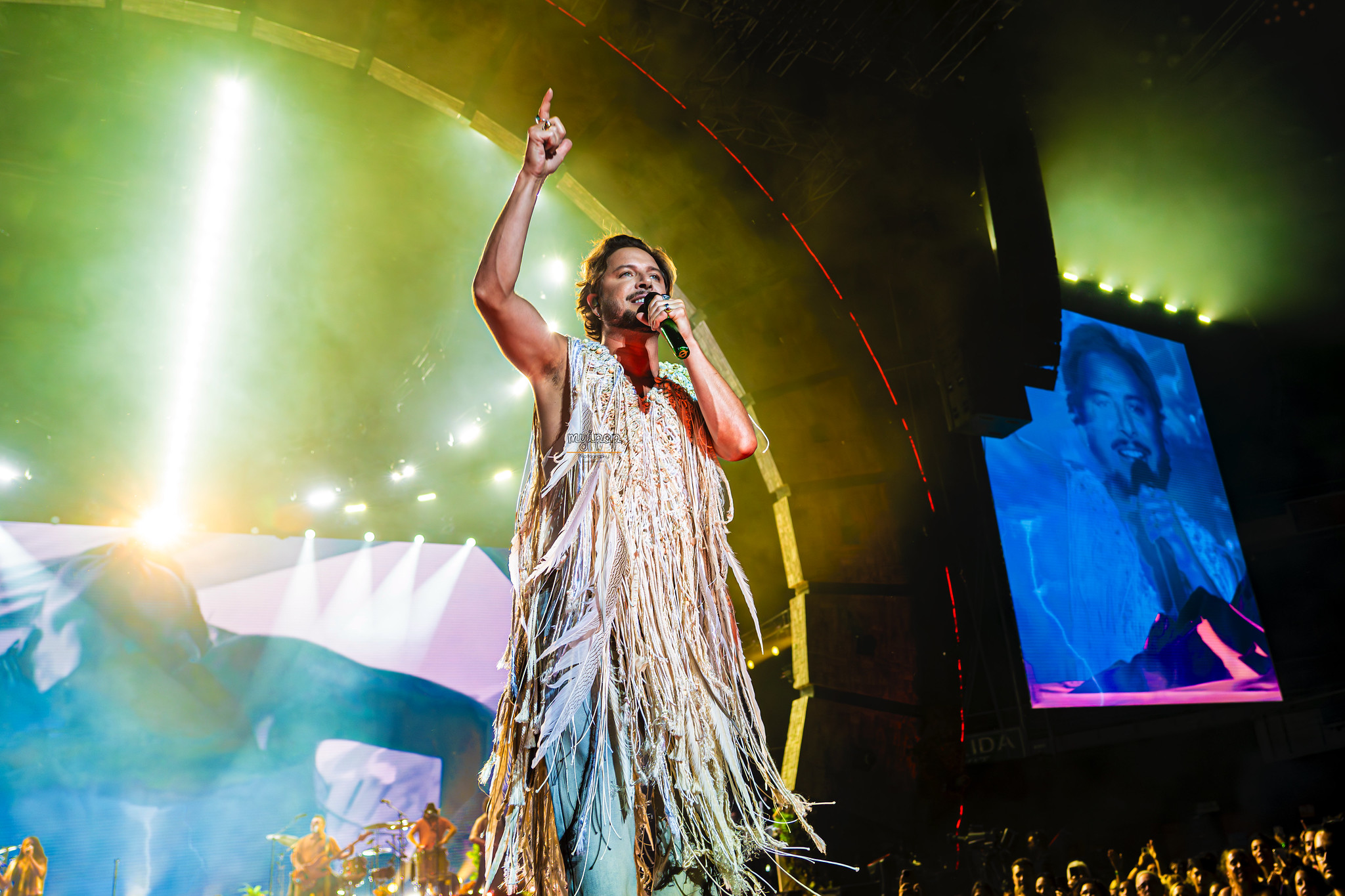 Apenas unos minutos pasaban de las 20:30h cuando, en medio de la pasarela, aparecía el artista con su guitarra. ‘El Grito Del Niño‘ y la canción que presta título al álbum, eran las encargadas de dar el pistoletazo a una noche que estaría llena de emociones. Pronto, los cánticos se elevaban con fuerza gracias a ‘Hay Que Vivir El Momento‘ y ‘Corazón Y Flecha‘ dejando claro que Madrid iba a vivir una auténtica fiesta celebrando la vida.